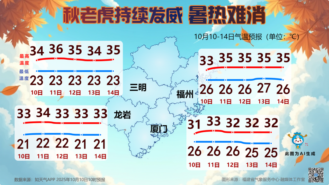 气温方面,虽然已进入寒露节气,但是副热带高压依然强势不肯让步,导致福建天气不走寻常路,秋老虎持续发威,福建多地闷热天气继续。如省会城市福州,未来5天将再迎35℃高温天气。暑热难消,朋友们外出需持续做好防暑措施。