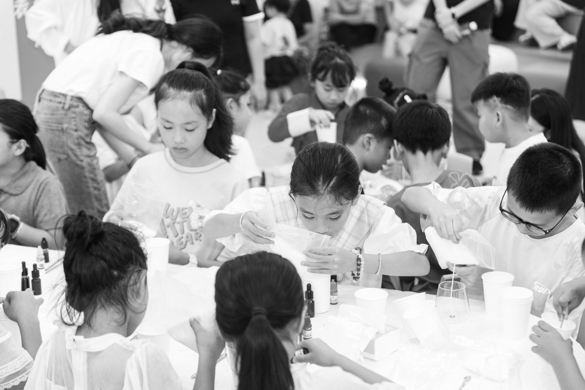 当晚7时,在共创共享中心,25名小朋友开始进行创意沙画蜡烛DIY创作(如右图)。在老师指导下,孩子们将彩色沙蜡染料滴入原料中,通过调配、搅拌、分层填充等步骤,把对家国的深情融入亲手制作的沙画蜡烛之中。“我要捏一座美丽的大山”“我想做一片蓝色的海洋”“我要把这条河搅拌成粉色的!”“这棵黄色的大树真有趣……”活动现场,孩子们开心地说。一小时后,一件件以“地球”“星空”“海洋世界”等为主题的作品陆续完成,孩子们手捧作品,脸上写满自豪与喜悦。