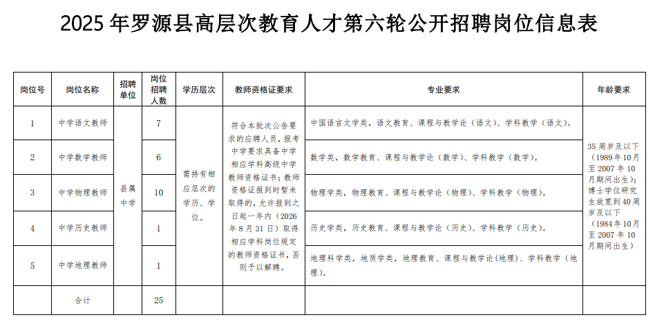 福州市罗源县教育局组织教育人才第六轮公开招聘教师25名