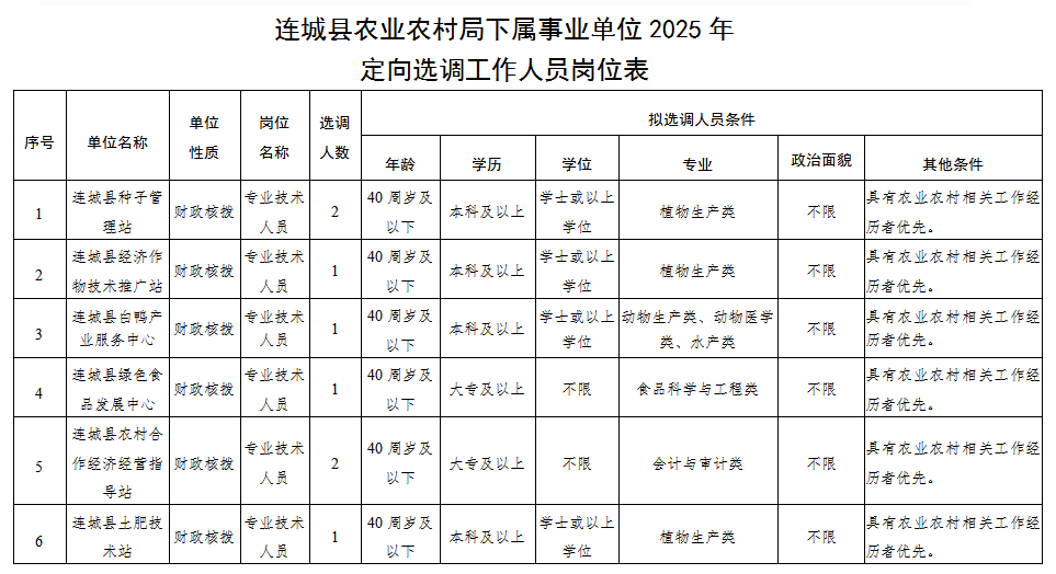 龙岩市连城县农业农村局关于下属事业单位定向选调工作人员8名
