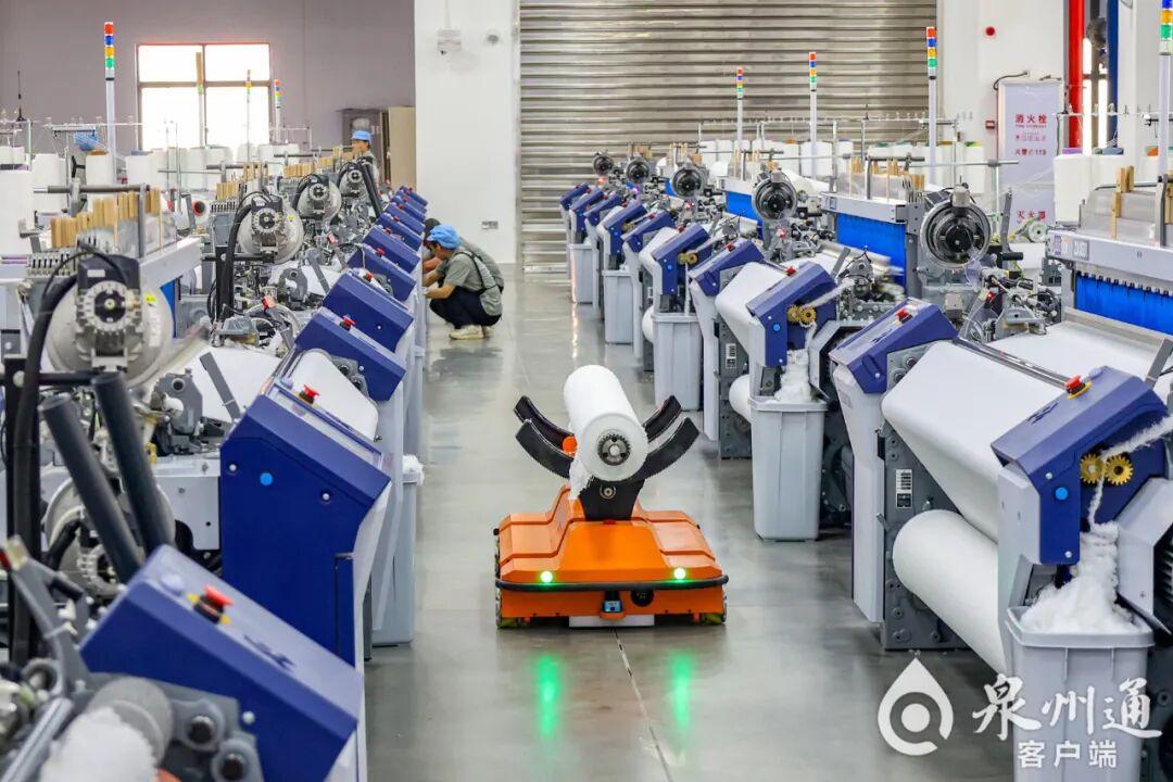 在石狮豪宝织造有限公司试生产的车间内,自动挂纱、自动落布、自动穿综、AGV小车穿梭取布,随处可见的智能化设备,让生产流程更加顺畅,偌大的一个车间,仅需要几名工人看管即可。(李荣鑫 摄)