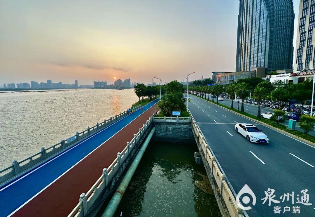 在泉州市区丰海路晋江大桥段,市民在新修复的沥青步道上休闲和锻炼。(泉州晚报社融媒体记者 陈晓东 摄)