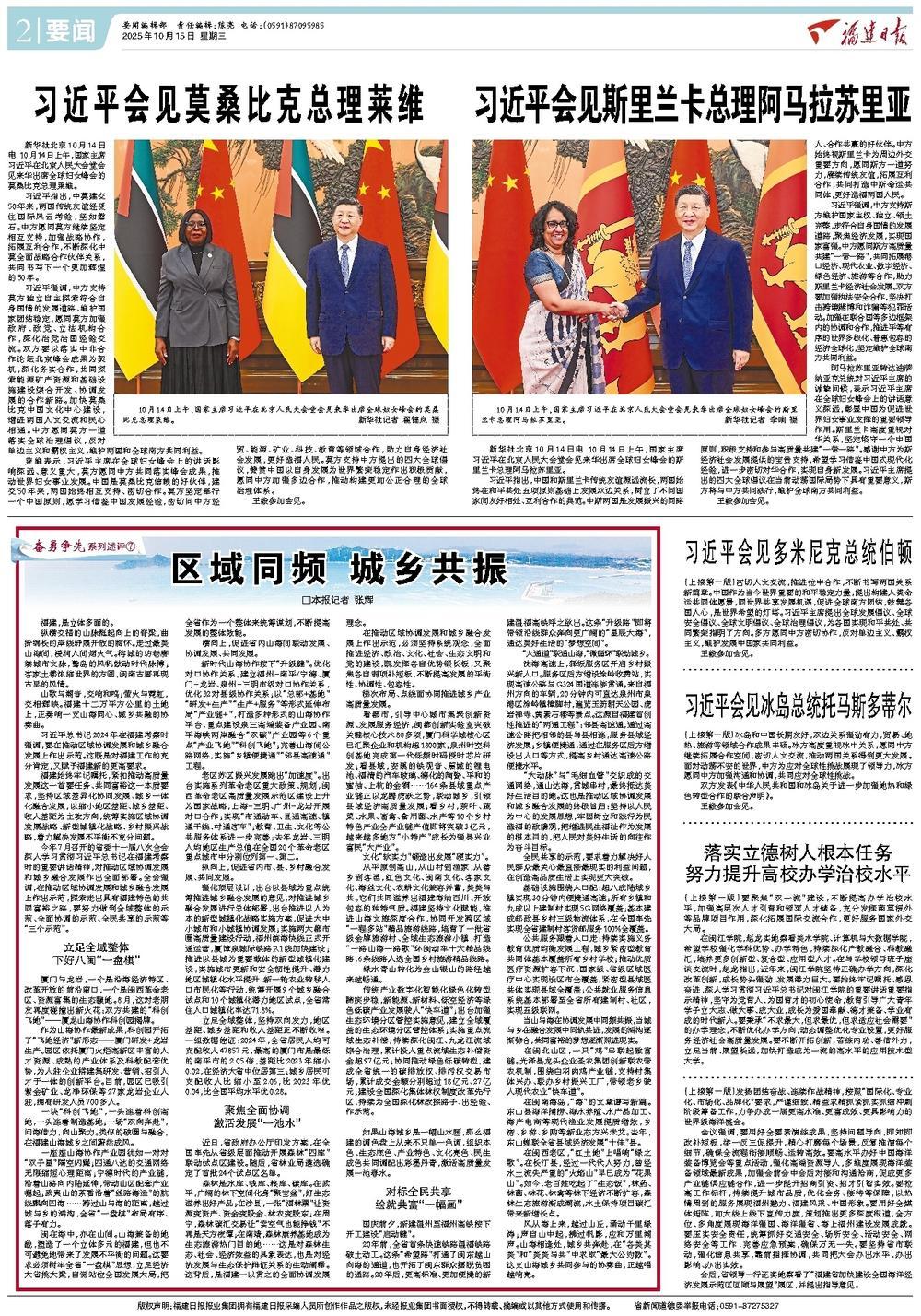 福建始终牢记嘱托,紧扣推动高质量发展这一首要任务、共同富裕这一本质要求,坚持区域差异化协同发展、城乡一体化融合发展,以缩小地区差距、城乡差距、收入差距为主攻方向,统筹实施区域协调发展战略、新型城镇化战略、乡村振兴战略,着力解决发展不平衡不充分问题。